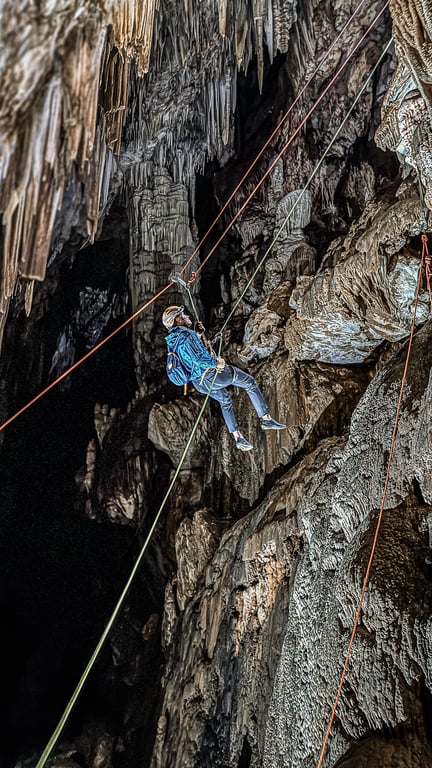 A aventura começa quando você enfrenta um emocionante primeiro rapel de 40 metros e um segundo rapel de 10 metros — ideal para iniciantes! Saia da parte iluminada e entre na escuridão, sentindo a mistura de emoções.