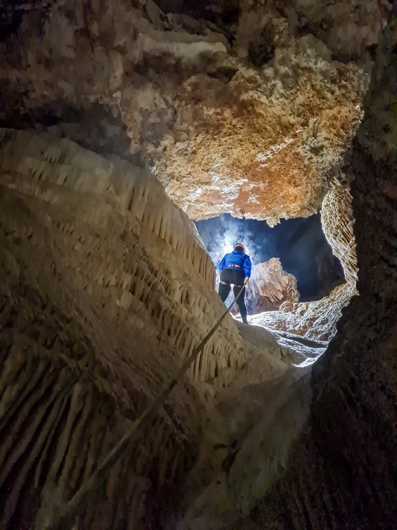 Na verdade, fazer fotos na caverna, especialmente durante o rapel, não é fácil — exige equipamento especial ou celulares de última geração, e ainda assim é quase impossível tirar fotos realmente boas naquele momento.